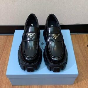 Elegant black leather loafers by Prada. Sleek design with signature logo detail. Perfect for versatile styling.