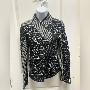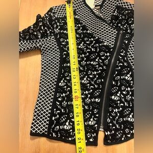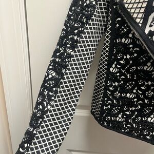Zip up blazer, cardigan sweater, Moto jacket from anthropologies MOTH label. Black-and-white knit with a lattice, plaid and lace design. Asymmetrical zipper with crossover V-neck collar. Moto silhouette that can be used as a sweater or a lightweight jacket. Brand new with tags. Sea measurements and pictures.