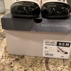 Chic cream Maryjane’s with 3” heel & a sleek black patent toe. Nonslip bottoms. Cute when you go to work, dress up or really cute with jeans. Like new.