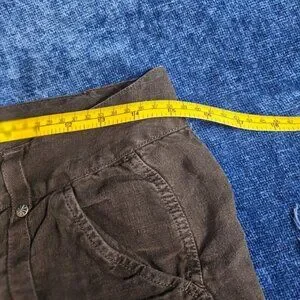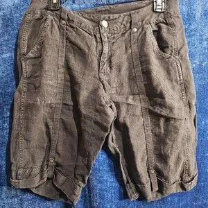 Super comfy 100% linen shorts by Athleta in black. Longer length ensures these don't ride up and provides better coverage but is still light and breathy for doing chores or camping. Marked size 6 or small medium, waist measures 15" (38 cm), nice 9" (23) rise with 11" (28) inseam.