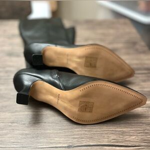 Black leather upper, Leather and fabric lining, Cushioned footbed, Leather sole, Pointed toe, Side zipper entry, Approx. 2.5" heel, Approx. 12" shaft.