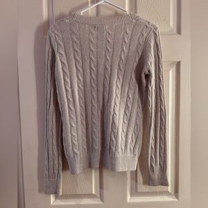 Beautiful cream sparkly cable knit cardigan with a flattering V-neck and button-up front. Features a shimmer woven throughout the knit that catches the light without being overpowering. Perfect for dressing up or adding a touch of sparkle to everyday outfits.