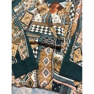Iman Global Chic Womens 2X Patchwork Print V-Neck Blouse Emerald Green Boho Top