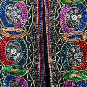 Glittering jewel colored bugle bead embellishment on black silk with sequins make this statement, jacket, both gorgeous and versatile.