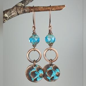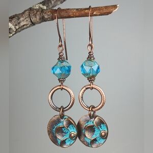 HAND CRAFTED Boho Copper Turquoise Patina Flower Blue Glass Dangle Earrings