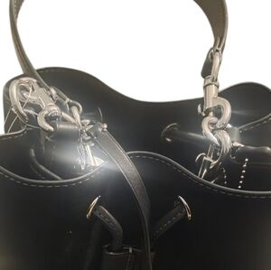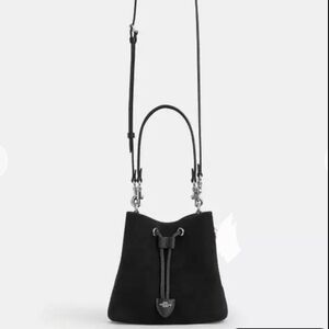 Stylish suede black bucket bag with leather accents and silver hardware.