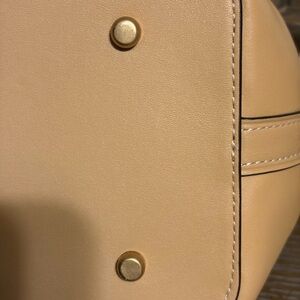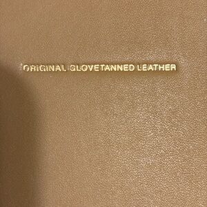This satchel is crafted of glovetanned leather and is designed with interior buckles to expand the side gussets. It features a top handle and detachable crossbody strap, and a tag.
