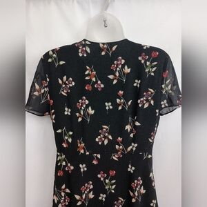 Chic dark blouse with floral pattern. V-neck and short sleeves. Stylish and versatile.