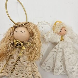 Beautiful lot of 2 handmade angel ornaments featuring mixed materials including crocheted yarn, lace fabric, wooden heads, and gold hanging halos.