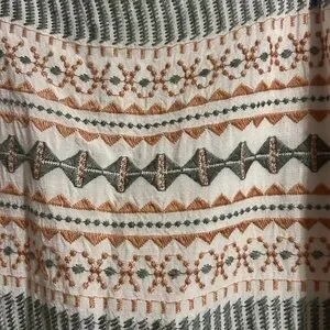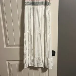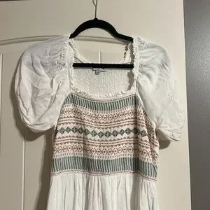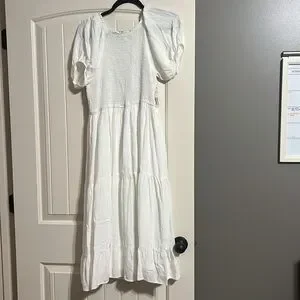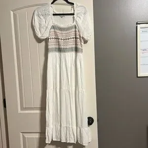 Elegant maxi dress by Polagram. Features puff sleeves and intricate tan patterns. Perfect for any occasion.