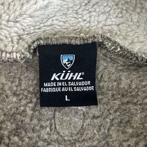 Brand markings: Woven Kuhl neck label with shield logo, Made in El Salvador text, and size L; metal zipper pull with Kuhl shield emblem; embroidered shield logos at upper back and left sleeve; small woven Kuhl side tab at lower hem.