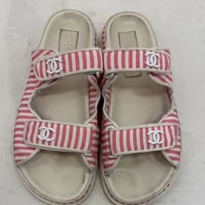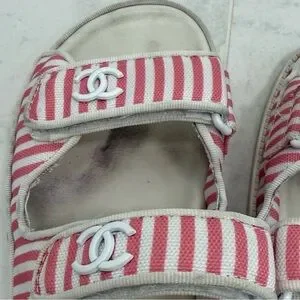 Chanel Printed Calfskin Velcro Dad Flat Mules Sandals Red Stripe 38 EU / 8 US