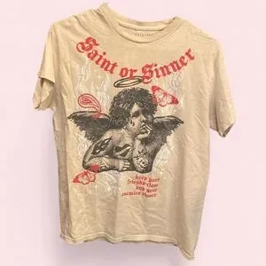 Express your style with the Saint or Sinner graphic tee. This tan short sleeve shirt features a bold design, perfect for casual outings.