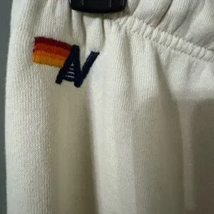 Aviator Nation 5 Stripe Sweatpants in Vintage White - Size L sweats - Brand new never been worn! - Adjustable tie inside and cuffed at bottom - Hand sewn in Los Angeles - Tri-Blend Fabric: 50% polyester, 38% cotton, 12% rayon - Machine wash cold with like colors. Hang or tumble dry on low