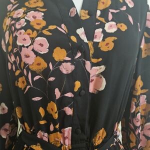 Nanette Lepore chic and classy long sleeve dress with a floral design. Features pink and orange flowers on a black background, belted waist, button front bodice, collar, tiered bottom, dress is in like new condition, no rips or smell slightly sheer material. See pictures for more description. This dress is perfect for stylish outings.