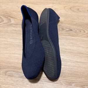 Chic and comfortable flats by Rothy's. Features a sleek navy design with a vertical block of stripes at the back—colors of light blue, tan, and white. Super comfy brand and perfect for versatile wear. Worn 1-2X. Excellent Used Condition. Sz 8.5.