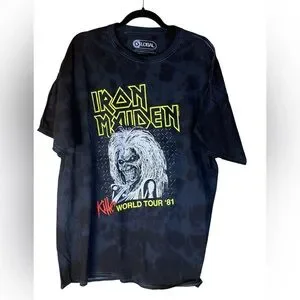 Up for grabs is this killer Iron Maiden graphic T-shirt featuring the iconic "Killers" World Tour '81 artwork. This isn't your standard flat black tee—it features a subtle dark charcoal tie-dye/washed finish that gives it an authentic vintage feel right off the rack.