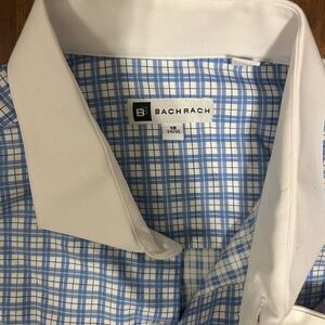 Elegant dress shirts by Bachrach. Features blue checkered, gray striped, and purple checkered designs. Ideal for formal and casual wear.
