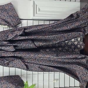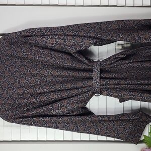 Elegant floral patterned robe with a matching belt. Features a button-down front.