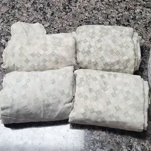 They have been WASHED and sanitizedand and as such slightly faded. They were purchased to be used in a therapy office but were not used. IN LIKE NEW condition. Med line brand patient hospital gowns/ hospice/ physical therapy or chiropractic gowns that are machine washable. This is for a total of 4 gowns. This does have a shoulder snaps on both sides as well as 2 tie backs one up top and down below. These are a pretty calm green/ tan pattern/ color. This has two ties one high and one below. The fabric is 55% cotton and 45 % polyester. Washes very well and machine washable and breathes well. It is not hard but soft feeling for patient comfort. This also has a front pocket. From a smoke and pet free home. I ship quickly from Illinois. These are sturdy gowns and will last a lifetime! Approx sizes are as follows: length 48 inches, sleeve length is 19 inches. Fits most people size medium through XXL. This is one size fits most. Can be worn front and back as the ties is easily accessible.