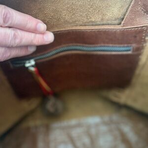 Features an unlined suede leather interior, an interior zip pocket with leather pull, and a subtle maker’s blind stamp inside — details commonly found in European / Italian artisan leather bags.