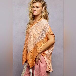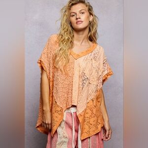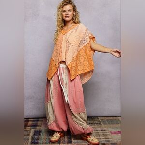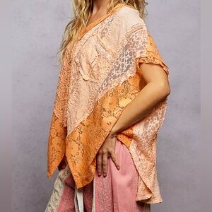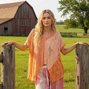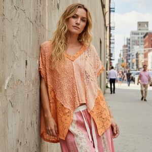 This oversized top blends boho, romantic, and granny patchwork aesthetics through a soft mix of lace panels. The textured fabric blocks arranged in an asymmetrical handkerchief silhouette. The design leans into cottagecore and fairycore moods with delicate lace contrasts and an airy, flowing drape that feels light and expressive. A relaxed V neck and short sleeves support an easy, free-spirited shape, while the chest patch pocket adds a subtle touch of indie practicality. Exposed seam detailing reinforces a craftcore and artisanal feel, giving the piece a worn-in, handmade character. The overall look balances vintage and whimsical aesthetics with a casual, artfully undone presence that works well for layered, everyday styling.