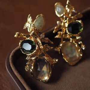 Clusters of black mother of pearl doublets, green quartz, labradorite and crystal give a subtle earthy glow on these earrings with Brutalist inspired, textured 14k gold plated metalwork.