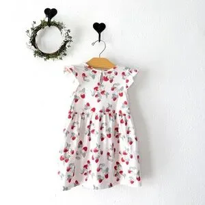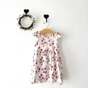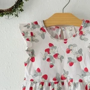Sweet H&M toddler girl dress featuring a strawberry and floral print on an off-white background. Made from 100% cotton, this dress is lightweight, breathable, and comfortable for everyday wear or special outings.