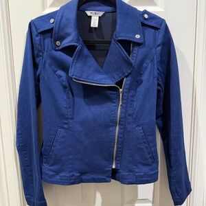 WHBM cotton blend moto style jacket in a vibrant royal blue. Great for jeans, skirts, dresses and slacks. Make every outfit memorable!