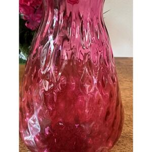 The diamond optic design and saturated cranberry tone are hallmarks of collectible mid-century art glass. A gorgeous example of elegant form meeting function.
