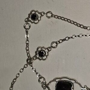 Keywords: long necklace, silver tone, faux gems, floral stations, fashion necklace, costume jewelry, statement piece, silver necklace, gemstone necklace, floral necklace, bohemian, gothic, dainty