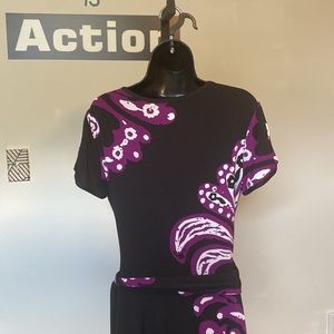 PRE-OWNED WOMEN’S DONNA MORGAN DRESS, FIT & FLARE FLORAL PAISLEY DESIGN, BLACK, PURPLE, WHITE, GOOD CONDITION- SIZE- 12-95% POLYESTER, 5% SPANDEX, ATTACHED BELT