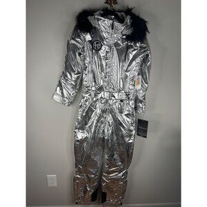 Tipsy Elves Sleek Silver Bullet Ski Snow Suit Fur Trim Hood New