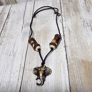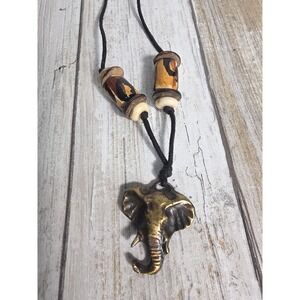 Bronze Elephant Pendant Necklace Boho Animal Print Beads Black Cord Jewelry