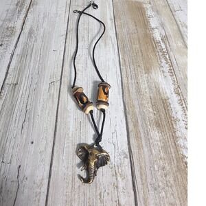 Bohemian elephant pendant necklace features a detailed bronze-tone metal elephant head as the focal point. The pendant is suspended from a black cord accented with large, hand-painted ceramic or resin barrel beads in an earthy tortoiseshell or animal print pattern, framed by smaller wooden spacers. This eclectic piece offers a bold, safari-inspired aesthetic with a secure lobster claw clasp and adjustable length.