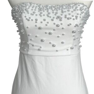 A stunning and elegant Lulus white strapless embellished gown in Size Small, NWOT. This figure-flattering formal maxi features a structured strapless bodice adorned with pearl-like beading, a sleek fitted silhouette, and a graceful mermaid hem. Perfect for bridal showers, engagement shoots, rehearsal dinners, or any formal event requiring a clean, timeless look.