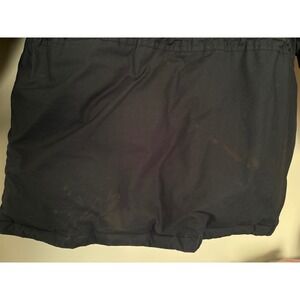 Heavyweight field parka in a deep black finish, constructed with a durable shell and insulated for warmth. This utilitarian piece features a high-neck collar, full zip-front closure with a snap-button storm flap, and multiple functional pockets including zippered chest compartments and angled hand pockets. The waist is adjustable via an internal drawstring with decorative leather-look patches on the exterior. **Note that this item shows slight staining and discoloration on the back lower hem and sleeve as pictured.**