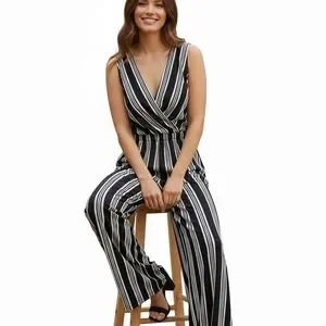 Stylish jumpsuit with slimming stripes pattern. Sleeveless design. Perfect for versatile styling. This jumpsuit is so comfortable as it is a cotton knit and feels like pajamas yet is so stylish. Has a snap to make the v neck more modest if so chose and is machine washable.