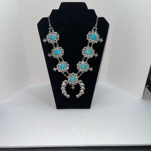 This necklace is absolutely stunning. Rhinestones and faux turquoise stones set in a silver tone design like the Native American’s beloved squash blossom necklaces. She is 20 inches long with a 3 inch extension chain. She has been worn only once by me and she deserves to be worn and shown off.