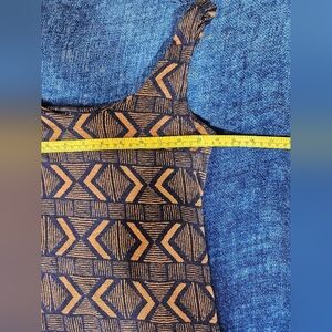 From Urban Outfitters, Staring at Stars sleeveless tank dress with geometric Aztec batik pattern in deep orange and navy blue, size small with built in shelf bra. Fitted design, super super soft comfy dress! flat lay measurements chest 14" length from armpit 41"