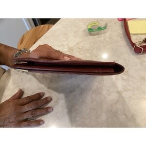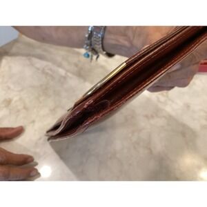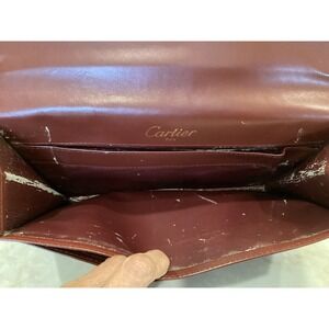 Elegant vintage Cartier clutch bag, featuring a rich brown leather exterior and distinctive gold-tone corner accents. This classic clutch showcases the iconic Cartier logo subtly embossed on the front. The interior reveals a spacious compartment with a magnetic closure. Please note that the interior shows signs of wear, as depicted in the photos.