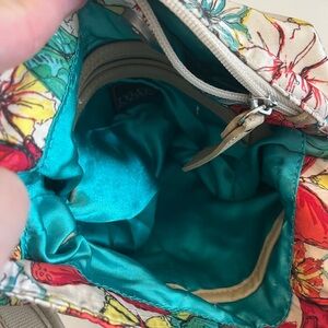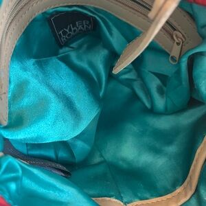 This Tyler Rodan purse features a bright floral and butterfly design. The outside has two zipper pockets, one on each corner. The inside is a bright blue color. There is a zipper pocket and some open pockets on the inside. There is a little peeling near the rings of the strap and on one part of the strap as well but otherwise in great condition. Strap is adjustable