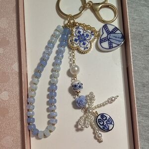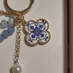 Add a touch of whimsical elegance to your favorite handbag or keys with this stunning nOir charm! Brand new in its original gift box, this piece features beautiful blue and white beads, along with charming butterfly and floral accents. It's a versatile accessory that can easily attach to any bag, adding a unique and stylish flair. Perfect as a gift or a lovely treat for yourself!