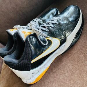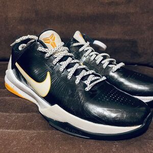 Up for sale is a pair of Nike Zoom Kobe 5 Del Sol sneakers in men's size 10.5. These sneakers are in excellent condition with minimal wear and have already been authenticated. The black synthetic upper is accented with marigold yellow and white details, and the outsole is made of rubber for durability. These sneakers are perfect for both activewear and casual occasions and can be worn year-round in winter, summer, fall, and spring. The lace-up closure ensures a secure fit, and the shoe shaft style is low-top. These sneakers are part of the Nike Zoom product line and are model number 386429-002.