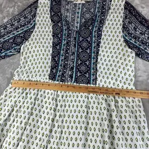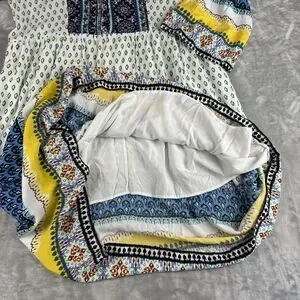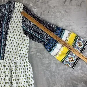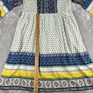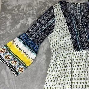 ~ So much fun details in this colorful dress! White with splashes of blue, yellow, and fuchsia. Buttons and loops down the front, 3/4 bells sleeve, lined skirt. Elastic at waist.