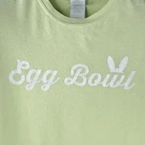 Such a cute RANDO T-shirt! I love t-shirts like these because of how unique they are; I’m pretty sure only a handful were made for a casual event, who knows, but I do know that it is a super cute t-shirt regardless. Somebody, with style and taste definitely designed this work t-shirt because the white font of the Egg Bowl graphic with the rabbit ears surrounded by a lime green canvas is just genius! This is so punk and hipster chic: the New York Life Egg Bowl Event; what does that mean, nothing haha but it’s such a cute t shirt to lounge in and go out in, oh yeah, it’s that cute. Pair these with a light pair of skinny jeans with some dope ass kicks and you’re ready to head to the hip, local coffee shop. It’s in perfect USED condition, meaning there are no stains, markings, holes or tears, but it’s just worn, so worn, that the white print is cracking. I wouldn’t have it any other way. “I wants this cute random t-shirt new,” said nobody! The Size is a Women’s S