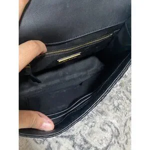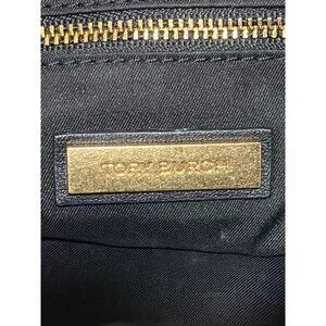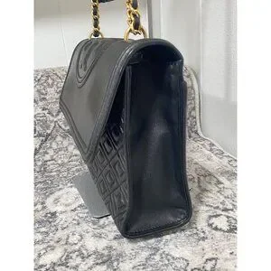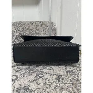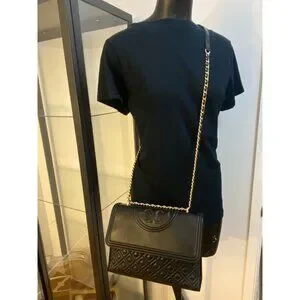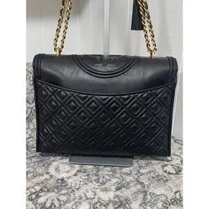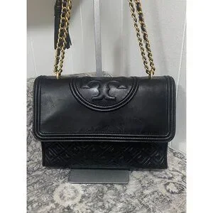 Tory Burch Fleming Convertible Shoulder Bag in Black Leather, flap closure with magnet, outside back slit pockets, inside double slit pocket, inside zipper pocket, black fabric lining,