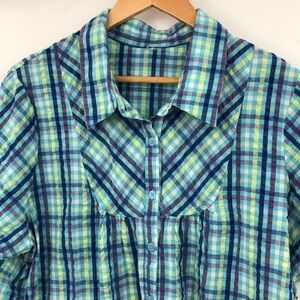 Preowned top. No stains or hole. Button down. Plaid. No fabric or size tag s so please see pictures for measurements and compare to a similar item in your closet before purchase. Fabric feels like a cotton fabric. Seersucker. Feels like it would be breathable and great for a warm spring day.