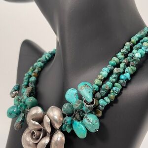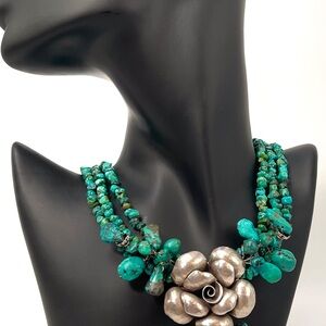 Beautiful Barse turquoise necklace featuring a large sterling silver floral pendant and chunky beaded accents. The necklace measures ?? inches in length.