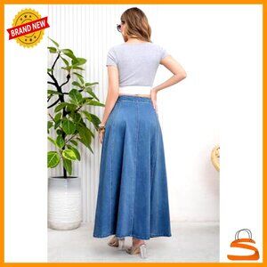 High Waisted Button Fly Flared Denim Maxi Skirt Pleated Swing A-Line